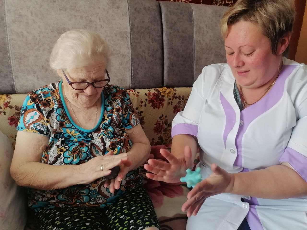Жители отделения «Специализированный жилой дом для граждан пожилого возраста и инвалидов» ГБУ «КЦСОН Краснобаковского муниципального округа» приняли участие в практическом занятии по самомассажу рук с массажными мячами.
