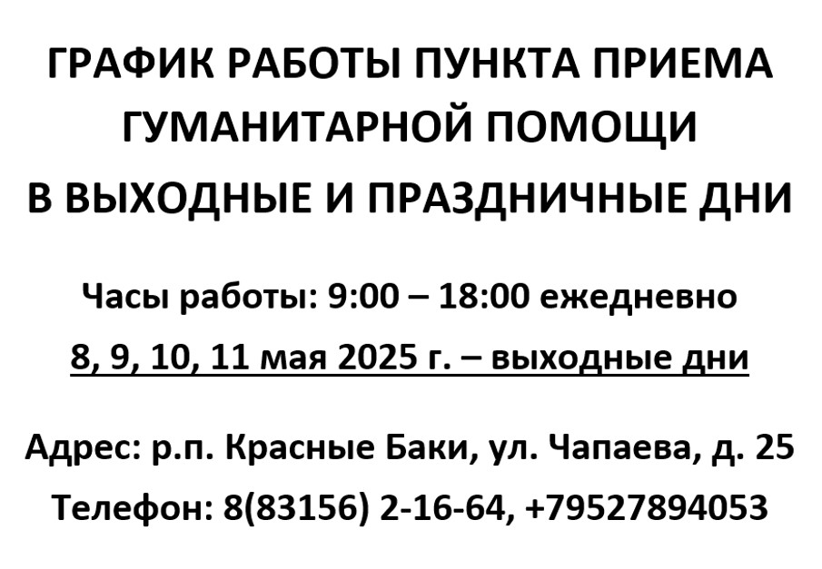 ГРАФИК РАБОТЫ ПУНКТА ПРИЕМА ГУМАНИТАРНОЙ ПОМОЩИ В ВЫХОДНЫЕ И ПРАЗДНИЧНЫЕ ДНИ
