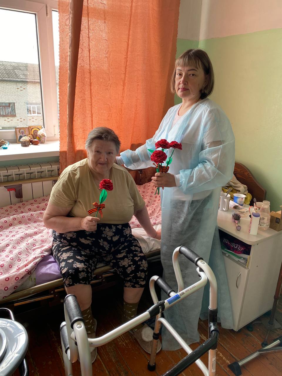 Празднование Дня Победы всегда сопровождается обилием красных цветов, особенно гвоздик. Ими чествуют ветеранов и военнослужащих, украшают мемориалы и Вечный огонь. Красные гвоздики прочно ассоциируются с героизмом, доблестью и храбростью. В преддверии 80-летия Победы в Великой Отечественной войне, обслуживаемые Отделения дневного пребывания ГБУ «КЦСОН Краснобаковского муниципального округа» под руководством инструктора по труду Т.В. Науменко смастерили красные гвоздики. Эти цветы были переданы маломобильным пациентам отделения сестринского ухода Краснобаковской ЦРБ. В преддверии праздника социальные работники отделения срочной социальной помощи поздравили пациентов больницы и вручили им эти символические подарки.