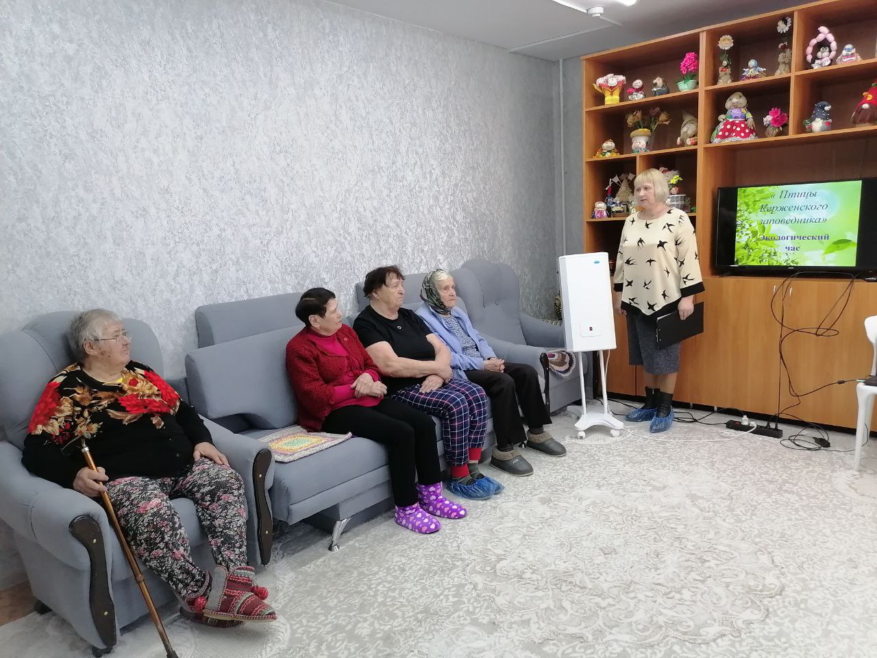 В отделении «Специализированный жилой дом для граждан пожилого возраста и инвалидов» ГБУ «Комплексный центр социального обслуживания населения Краснобаковского муниципального округа» состоялся экологический час  «Птицы Керженского заповедника».Керженский заповедник расположен на восточном берегу реки Керженец, которая является притоком Волги. Административно он относится к Семеновскому и Борскому городским округам Нижегородской области и находится на расстоянии примерно 55 километров от Нижнего Новгорода. В границах заповедника протекает семь рек, не считая множества ручьев и мелких притоков, из которых самой крупной является Керженец. Уже третье десятилетие Керженский заповедник ведет большую работу по изучению и охране природы. Одной из наиболее ярких и привлекательных групп живых организмов для человека были и остаются птицы.Сотрудник библиотеки Яшкина А.Ю. рассказала участникам мероприятия  о птицах Керженского заповедника.
