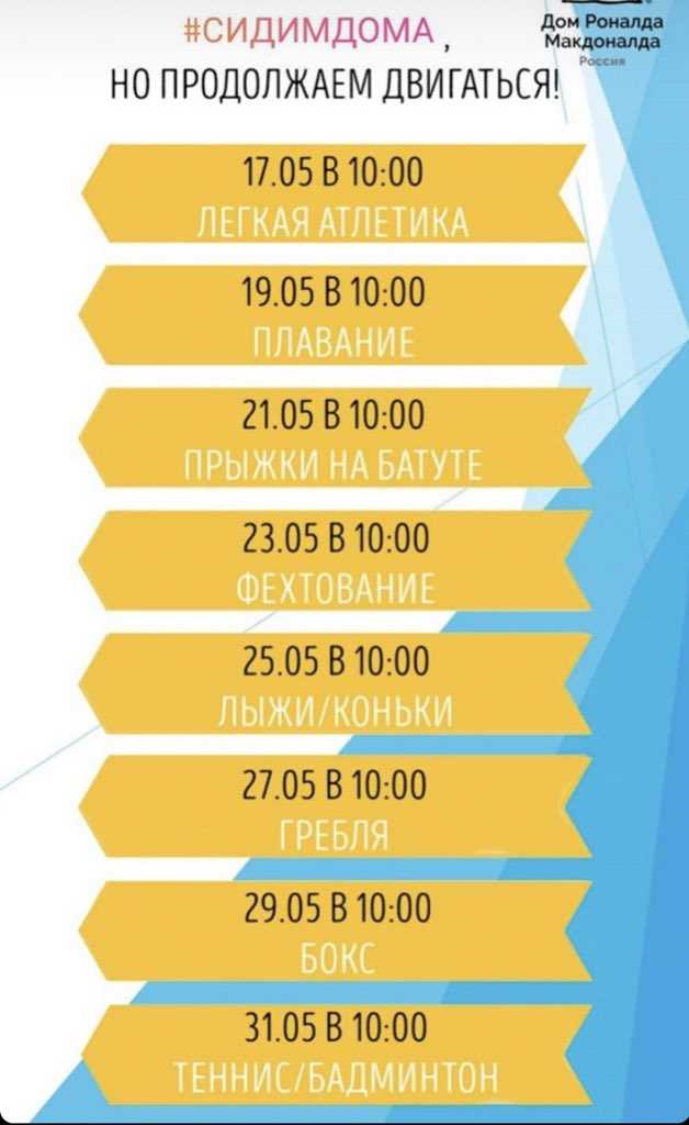 Расписание домашней зарядки и подключение в прямой эфир размещено в социальной сети Instagram: https://www.instagram.com/rmhc.rus/.