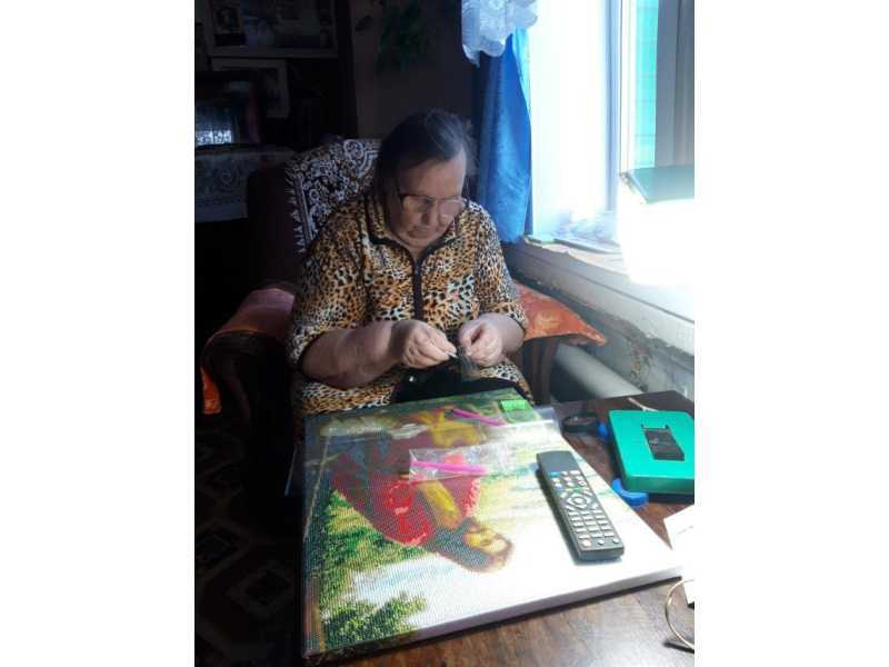 В ГБУ КЦСОН Починковского муниципального округа находится на социальном обслуживании эта замечательная женщина,Савинова Римма Ивановна которая занимается алмазной мозаикой . Это уже 6 работа. Делает иконы, освящает в храме, а потом дарит близким на память . По ее словам это увлечение развивает мелкую моторику и успокаивает.