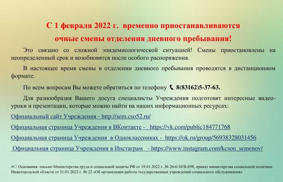 С 1 февраля 2022 г. временно приостанавливаются очные смены отделения дневного пребывания!